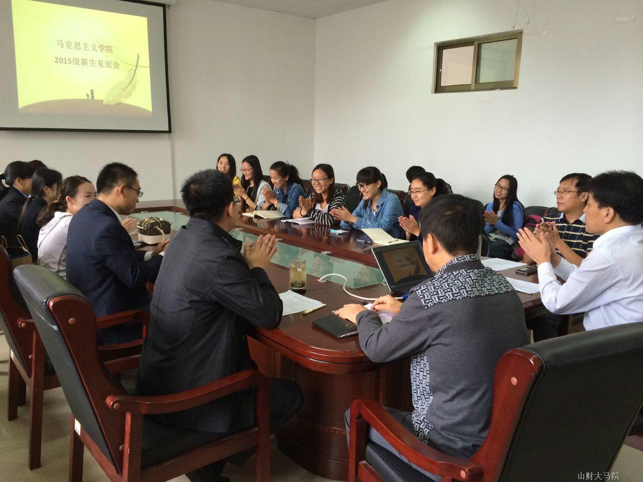 9�11日上午,马克思主义学院举�2015级研究生见面会。院长沈大光、党委书记郄捍烈、学院教授委员会主任委员毛玉美、院长助理张高臣出席见面会。见面会由院长助理赵付科主持�