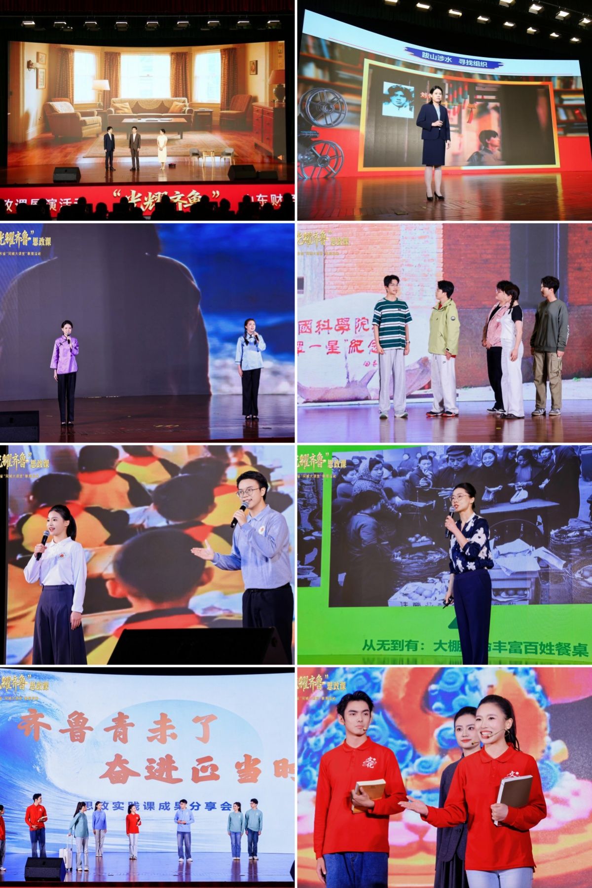 “光耀齐鲁”思政课首演紧扣“初心”“同心”“民心”三大主题,串联新民主主义革命时期、社会主义革命和建设时期、改革开放和社会主义现代化建设新时期、中国特色社会主义新时代等四个历史时期,将山东各时期的革命斗争、发展成就特别是新时代伟大变革成功案例转化为鲜活教材,以艺术化表达、场景化呈现、互动化传播等形式打造沉浸式思政课堂。本次活动安排了《尽瘁铭心》《追光之路》《沂蒙花开》《永怀赤诚》《“蔬”行天下》《河清民安》《齐鲁青未了》等7堂精品思政课,由我校和山东科技大学、空天信息大学(筹)、山东艺术学院、菏泽学院等10所高校的师生独立创作完成,生动诠释了广大师生对党的创新理论的深刻理解与感悟,体现了新时代青年学生在中国式现代化建设中的挺膺担当。