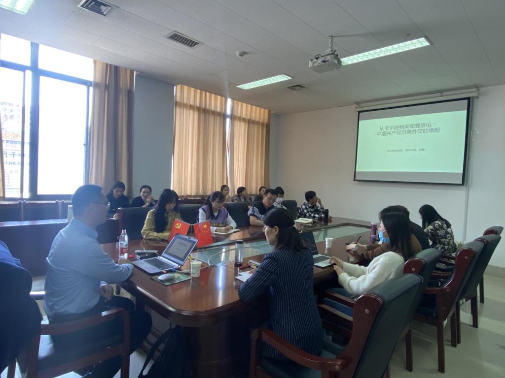 4�19日,为深入贯彻落实习近平总书记在党史学习教育动员大会上的重要讲话精神,高标准高质量推进我院党史学习教育,邀请中国社会科学院近代史所研究员侯中军到我院做了以“从卡尔逊到美军观察组:中国共产党对美外交的缘起”专题报告。报告会由徐莹副院长主持。部分师生参加报告会�