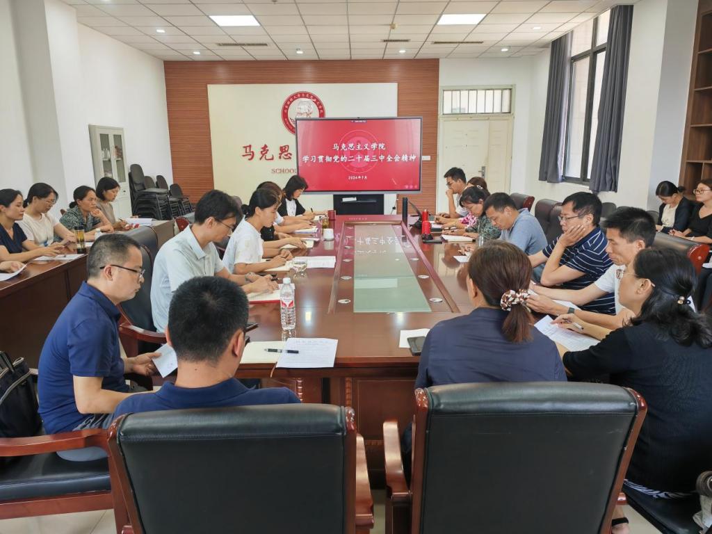 7�22日下午,马克思主义学院召开党委理论学习中心组(扩大)会议,传达学习党的二十届三中全会精神。党委书记石伟主持学习,学院党委理论学习中心组成员、各党支部书记、党员教师代表参加学习�