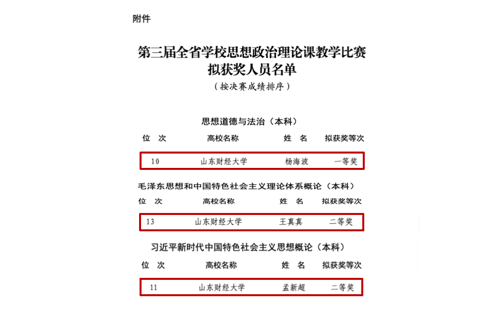 近日,山东省教育厅公布了第三届全省学校思想政治理论课教学比赛评选结果,我院思政课教师杨海波、王真真、孟新超在比赛中荣获本科组一等奖1项,二等�2项�