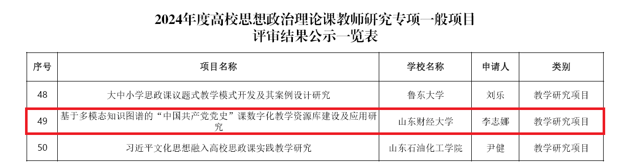 杩戞棩锛屾暀鑲查儴绀句細绉戝鍙稿2024骞村害楂樻牎鎬濇兂鏀挎不鐞嗚璇炬暀甯堢爺绌朵笓椤逛竴鑸」鐩瘎瀹$粨鏋滆繘琛屼簡鍏ず銆傛湰骞村害鍏辫瘎閫夊嚭绔嬮」椤圭洰200椤癸紝鍏朵腑鏁欏鐮旂┒椤圭洰101椤广佹暀瀛︽柟娉曟敼闈╂嫨浼樻帹骞块」鐩�10椤广佷紭绉涓潚骞存濇斂璇炬暀甯堟嫨浼樿祫鍔╅」鐩�30椤广佹暀瀛︾爺绌堕潚骞撮」鐩�59椤广傛垜闄㈡潕蹇楀鑰佸笀鐨勩婂熀浜庡妯℃佺煡璇嗗浘璋辩殑鈥滀腑鍥藉叡浜у厷鍏氬彶鈥濊鏁板瓧鍖栨暀瀛﹁祫婧愬簱寤鸿鍙婂簲鐢ㄧ爺绌躲嬭幏鎵规暀瀛︾爺绌堕」鐩�
