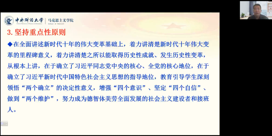 12�8日,应马克思主义学陀徐莹名师工作室邀请,中央财经大学马克思主义学院博士生导师赵付科教授,通过线上为我院教师做了题为《党的二十大精神融入<中国近现代史纲要>课的思考》的专题讲座。讲座由院长徐莹主持,《纲要》课教研室全体老师及其他教研室的部分老师聆听了讲座�