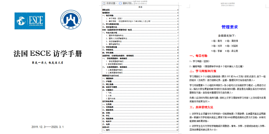 “团结就是力量,这力量是铁这力量是刚,比铁还硬比刚还强”,团结是力量发挥最大化的根本保证。此次访学行前准备时间较为紧张,但这更能体现财大学子的团结风采。为更好让学生们进行自我管理与服务,领队刘老师首先做好了法国ESCE访学项目学生管理的顶层设计:选定3名项目负责人,将30名出国访学研究生分成6个管理小组,每组由5位不同专业研究生组成,能够做到各专业相互兼顾,互帮互助;每组设一名组长,负责全组工作,再由3名项目负责人统筹管理。这样的科学管理架构有利于到达法国之后各项工作的统一开展。刘老师和法国ESCE中法学院院长李建乐老师共同协调,为团队制定了一套最合理、方便的往返方案;30名访学研究生通力配合、齐力协作,顺利完成了护照和签证办理;共同制作完成了主题为“聚是一团火,散是满天星”的一万五千字的“访学红宝书”,涵盖了境外学习、生活、出行及团队管理的方方面面,为大家迅速融入法国学习生活提供了有力指导。临行前,研究生院、国际交流处组织了全体访学人员行前培训,让我们了解了外事注意事项以及在国外的安全须知。爱之深,情之切。老师们就像叮嘱自己的孩子一样,把他们能想到的需要注意的一切都告诉我们。11月底,法国ESCE的校长和李老师来到财大,给了我们一个惊喜。在访学项目见面会上,老师与同学们互相认识,校长和李老师详细耐心地介绍学校位置、住宿环境和注意事项,为法国之行上了重要一课。12月2日晚,全体访学同学在首都国际机场集合,精神抖擞地踏出访学之旅的第一步。
